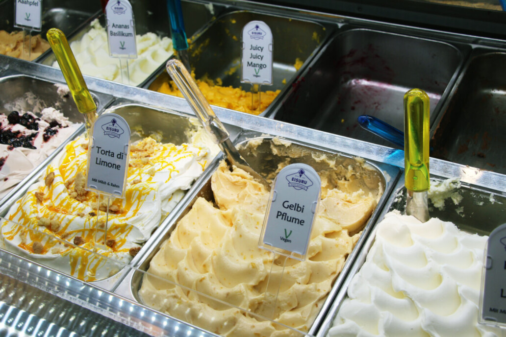 Die Glacémanufaktur in der Markthalle. Verschiedene Einflüsse wie japanische Spezialitäten und saisonale Früchte definieren das wechselnde Glacésortiment. Klassiker wie Fruchtsorbets und Rahmglacé sind ebenso zu finden wie besondere Geschmacksrichtungen wie Matcha und Kuro Goma (schwarzer Sesam).